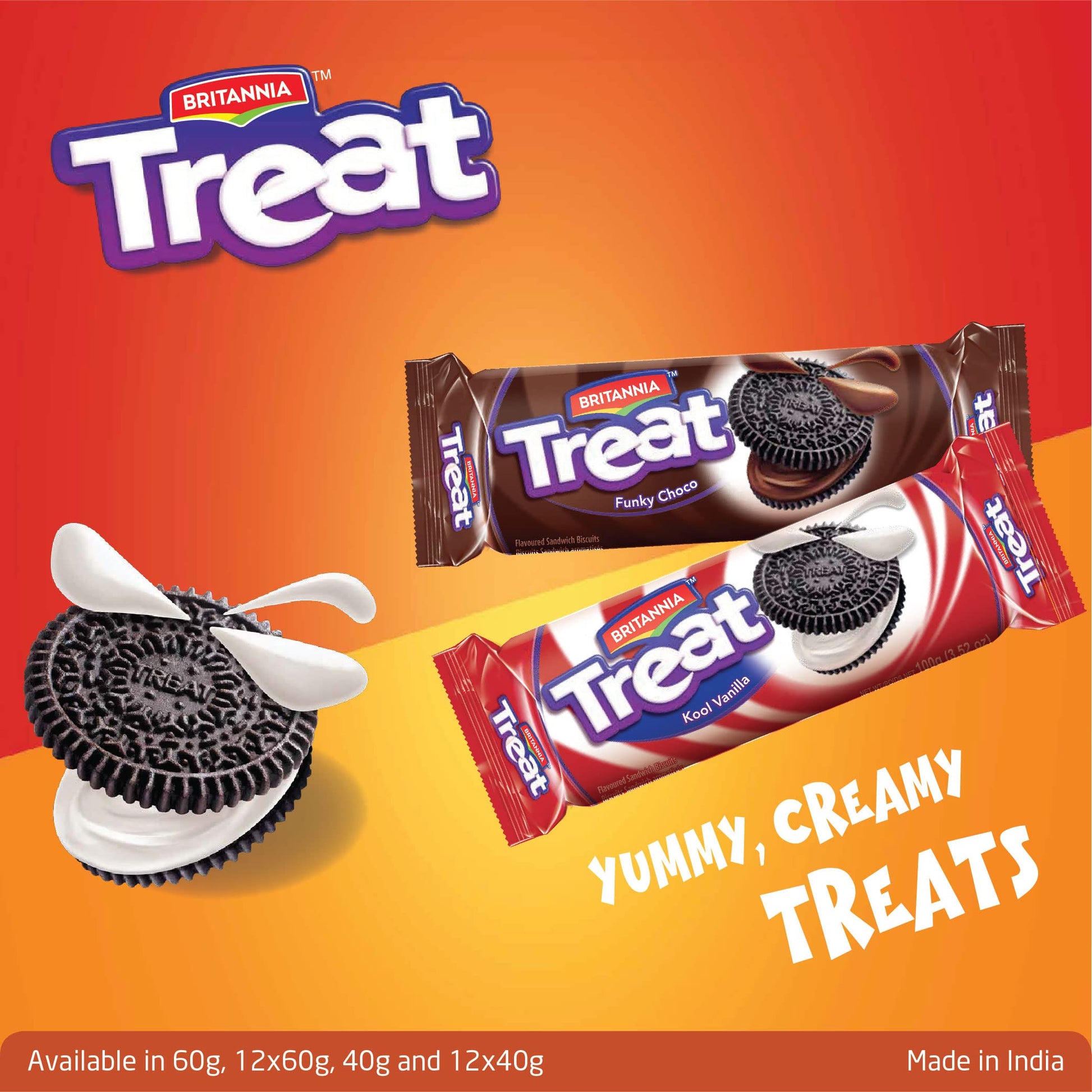 - Britannia Treat Choco cookies are a range that encapsulates a magical journey of taste, presented in various flavors like deuce milk choco, deuce white choco, vanilla cream. The outer cookies are baked to taste light and delicate while the filling is similar to the taste of a fudgy chocolate brownie.