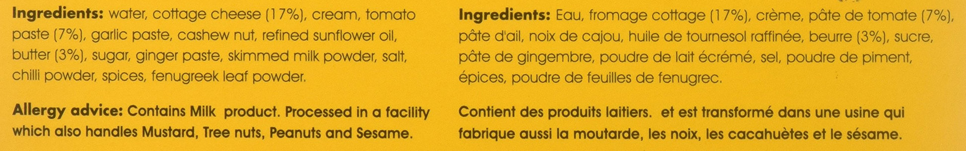 - Ingredients: Water, Cottage cheese (17%), Cream, Tomato Paste (7%), Skimmed Milk powder, Refined Sunflower oil, Cashew nut, Spices, Salt, Sugar, Butter (3%), Ginger paste, Chilli powder, Garlic paste, Fenugreek leaves powder
