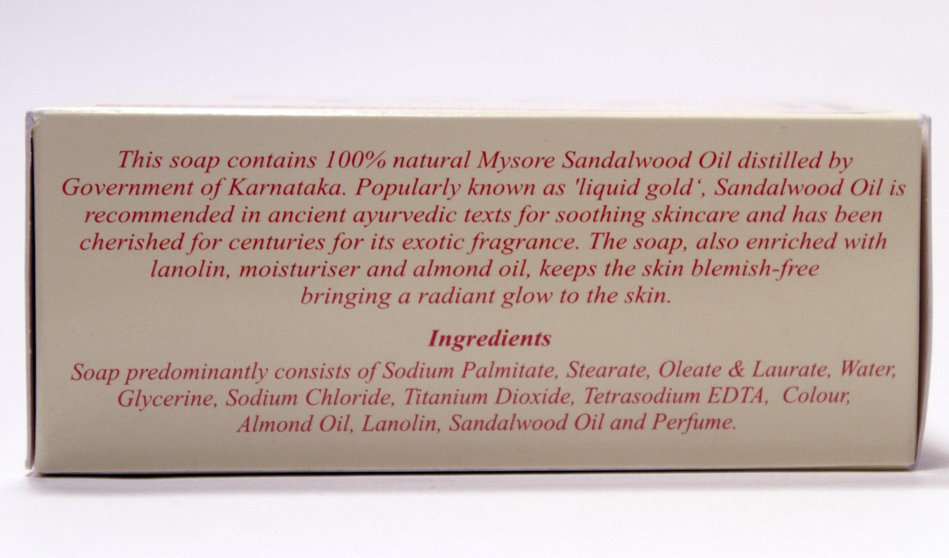 This soap contains 100% natural Mysore Sandalwood Oil distilled by Government