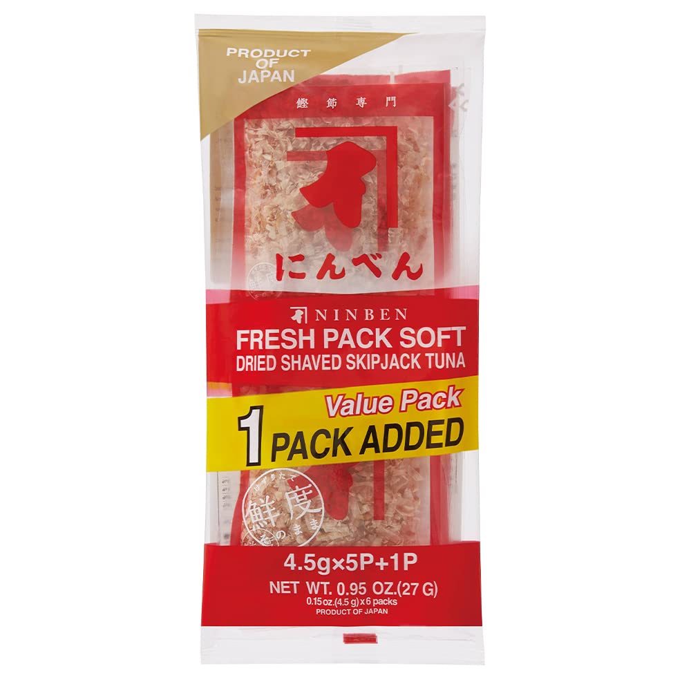 [Ninben] Authentic Dried Bonito Flakes (Hana Katsuo: ) Fresh Pack | Japanese Katsuobushi () | Fresh & Original Flavor | Dried Shaved Skipjack Tuna | Product Of Japan (0.95 Oz x 5 Packs + 1 Bonus Pack)