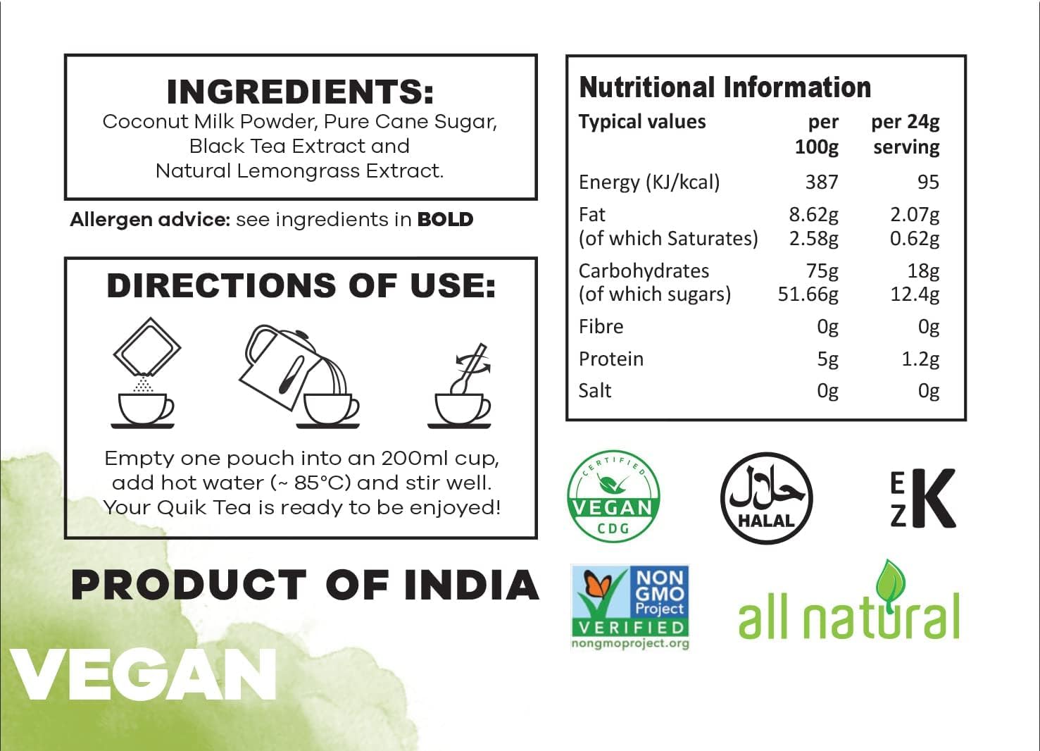 • VEGAN: Now offering Vegan! Whatever your life's journey may be, QuikTea has you covered! Our QuikTea Vegan line contains coconut milk powder, offering you a healthier vegan option and never compromising on taste!